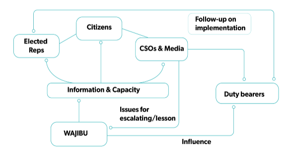 As it is in Path One, WAJIBU envisages working with key stakeholders including Media: Higher learning Institutions and CSOs not only as intermediaries to reach out the citizens (as in Path 1) but as pressure groups to advocate as well as demand accountability and good governance from duty bearers. The engagement process will involve sensitization, and the development of collaboration mechanisms which are assumed will motivate them to participate in disseminating WAJIBU's products and unlocking their potential, using their already existing networks and influence to demand accountability and good governance. WAJIBU will also get feedback from strategic stakeholders and complement these efforts with internal/ informal networks to influence government stakeholders (Duty bearers).