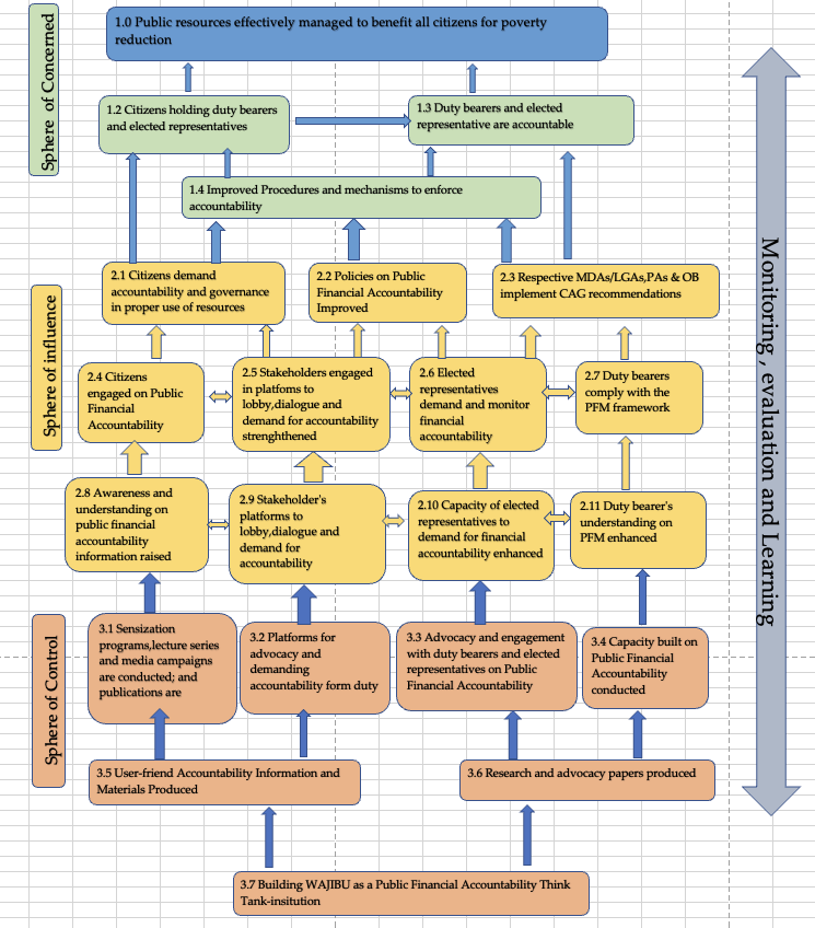 WAJIBU Theory of Change (ToC) built by using the vision, the core values, key strategic issues and the key performance indicators. The desired change is poverty reduction through capacity building, policy advocacy and research and; citizen engagement on public financial accountability. The hypothesis behind is the increase in financial accountability of duty bearers resulting from the implementation of CAG's recommendations, leading into better management of public resources which will eventually lead into poverty reduction in the country. The increase in CSOs and citizen engagement by disseminating them with simpler and reader friendly versions of the CAG reports, training and capacity building to different groups will influence the demand for PFA.